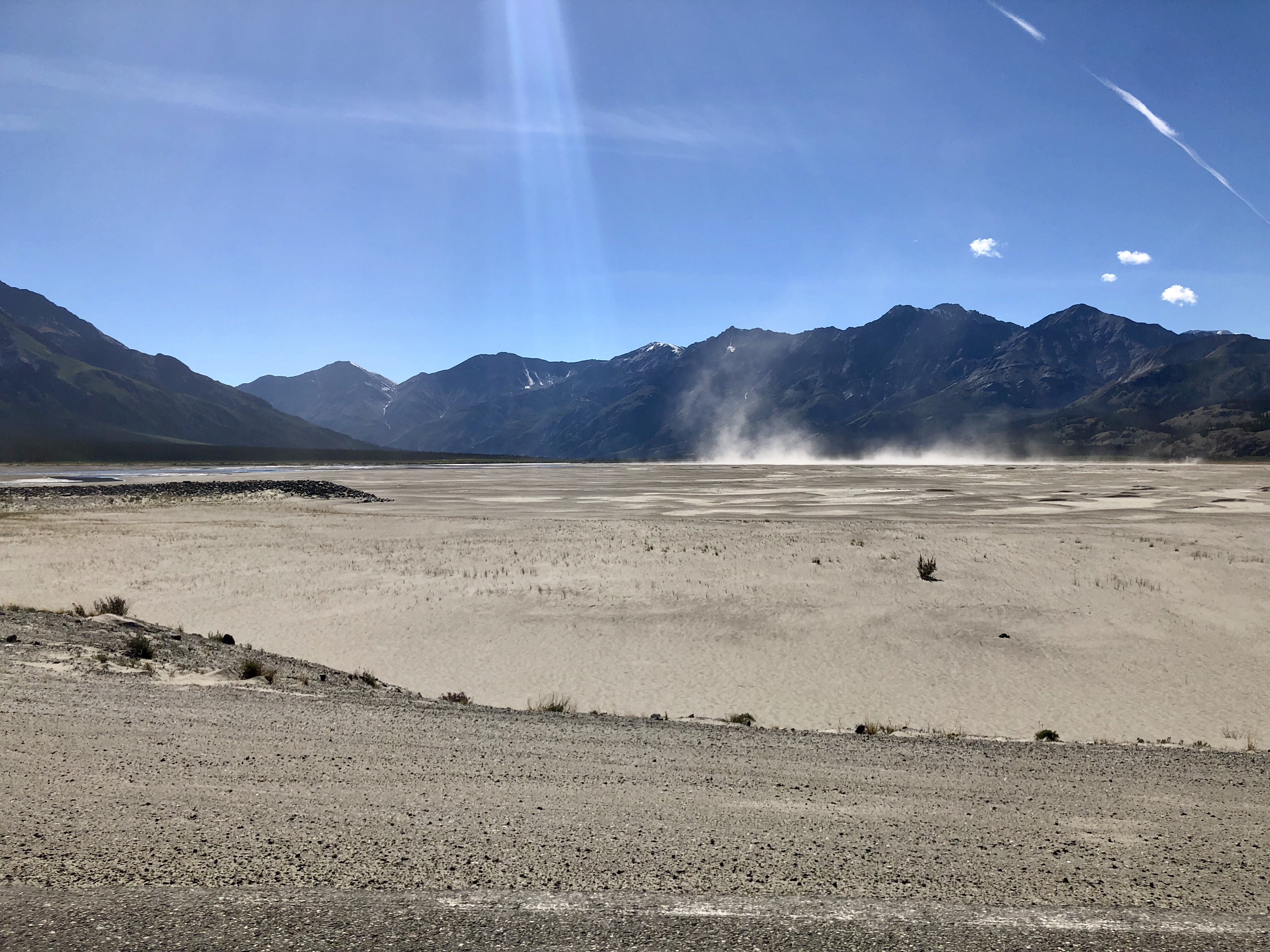 Kluane Lake is fed by the Slim River, being primarily the runoff from the Kaskawulsh Glacier just up the valley to the left in the photo, below. The dust we were seeing was airborne silt that had been washed down from the glacier to the now dry river delta, then carried aloft by the wind funneled down the valley as the cool glacial air rises as it passes over the warm, dry delta.