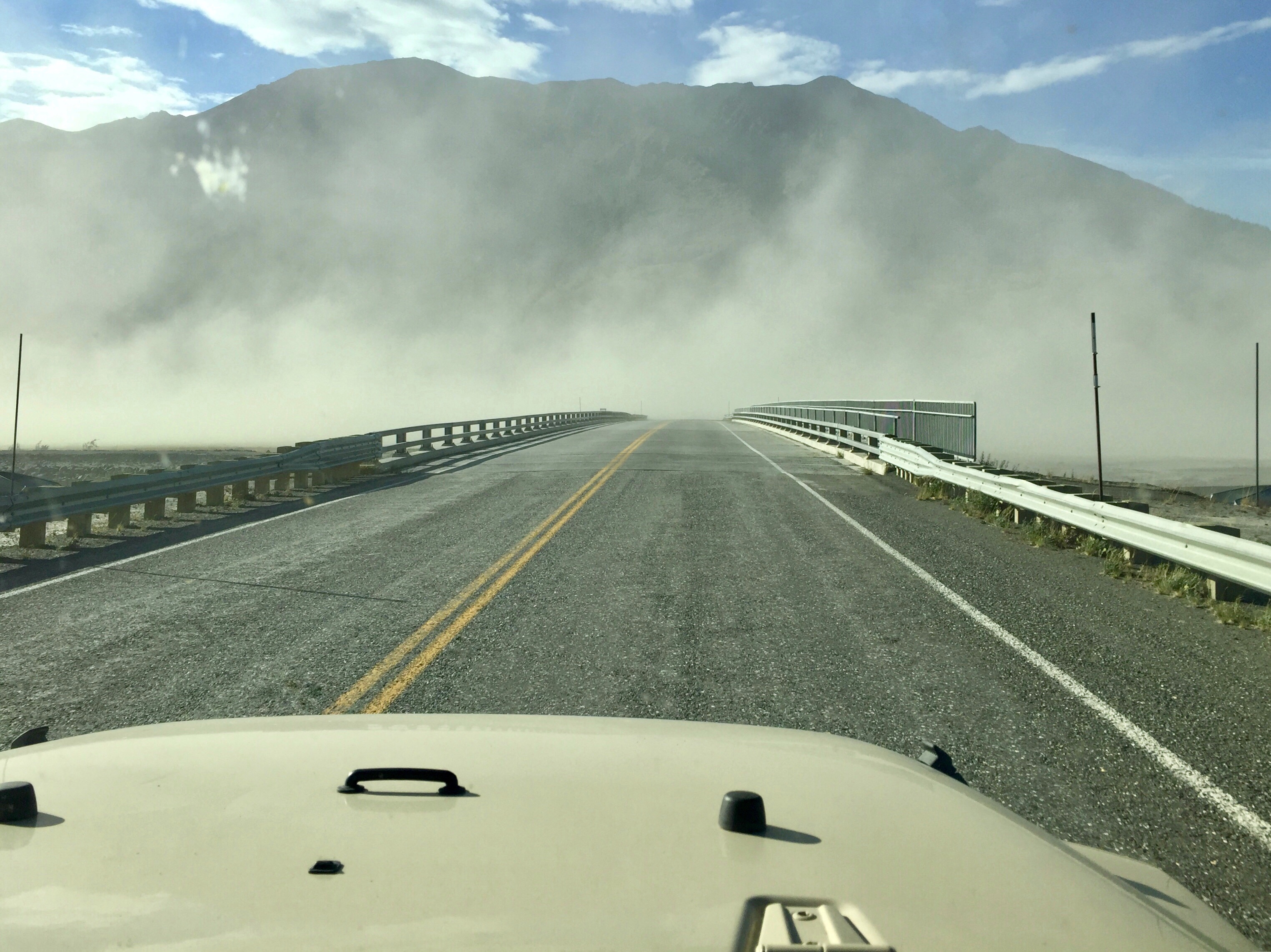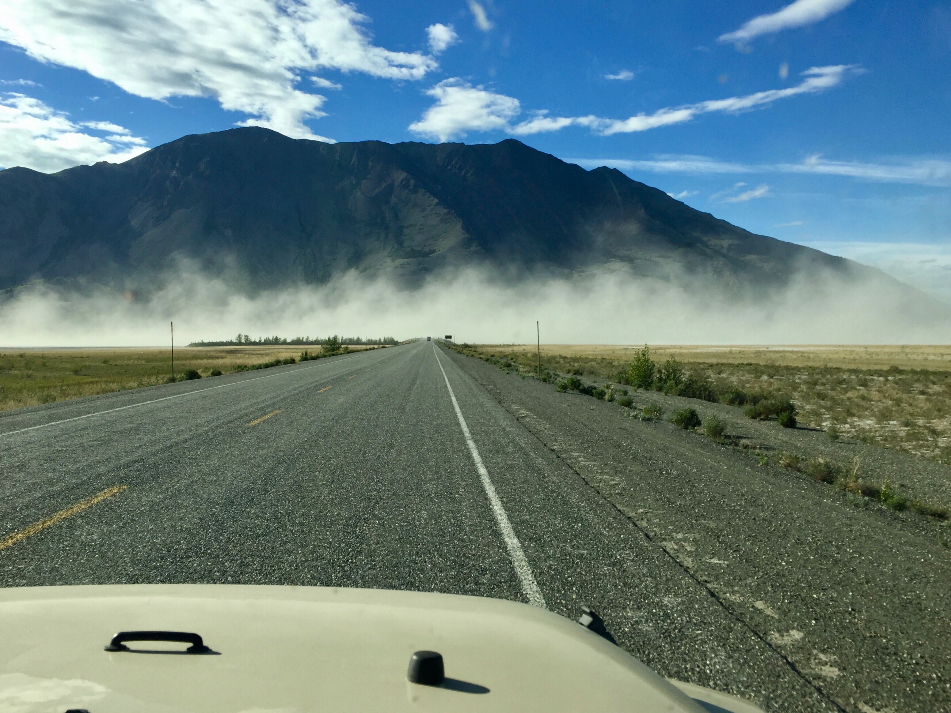 With just six miles to go, we saw what looked like a fire ahead at the Slim River crossing. But as we got nearer, we could tell that it wasn’t a fire, but some kind of dust storm.
