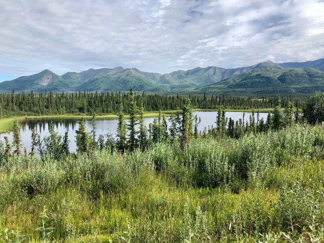 The scraggly trees you see in the pictures above and below are black spruce which typically grow in the shallow soils that lie above the permafrost. We continued our drive east, stopping to take the photo below of the Mentasta Mountains on the north side of the road.