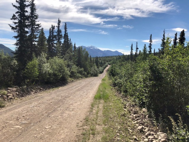 At mile 42, we arrived at Devil’s Mountain hunting lodge and its grass runway with several bush pilots milling around by their big-tired Piper Super-Cub bush planes. As we drove by, we noticed a couple of the lodge guests, modern-day prospectors, loading up their SUV with metal detectors.