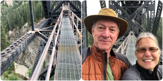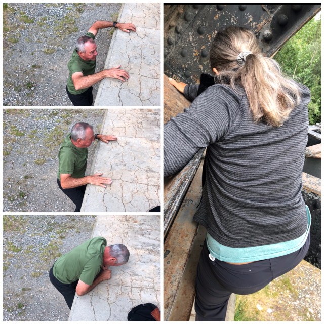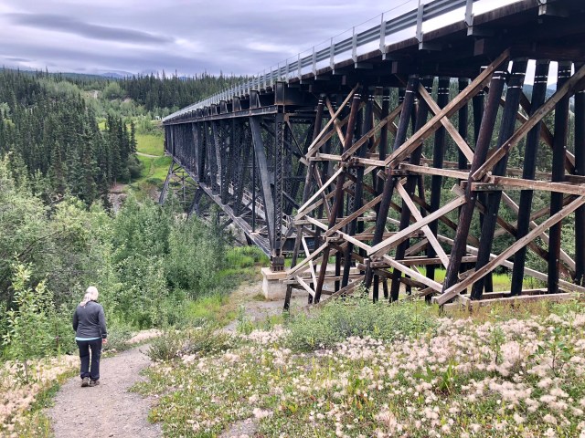When we were in Glennallen, we stopped at the Wrangell-St.Elias NP Visitor Center and a ranger there gave us a CD-ROM with a narrated tour to listen to as we drove the McCarthy Road. At the Kuskulana Bridge, the narrator invited travelers to explore the catwalk under the bridge, saying that you “might need a hand from a friend to climb up to the catwalk.” We parked after crossing, then hiked down to the base of the bridge. The way up to the catwalk begins at the concrete foundation you see where the wood trestle ends and the steel girders begin.