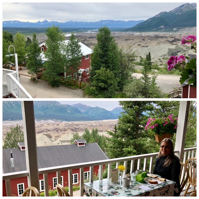 Happy to have arrived, we sat on the veranda overlooking the rock and silt covered Kennicott Glacier while eating lunch.