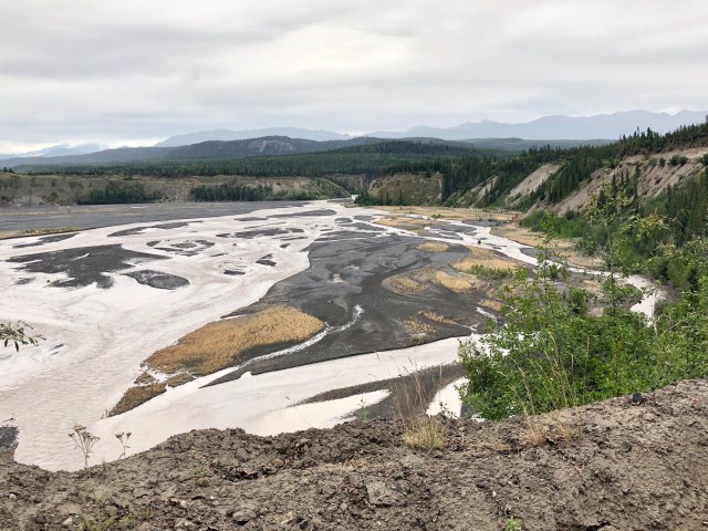 Here’s a photo of the braided Kotsina River delta at its confluence with the Copper River, just past the bridge. From here, the McCarthy Road heads east along the north bank of the Chitina River.