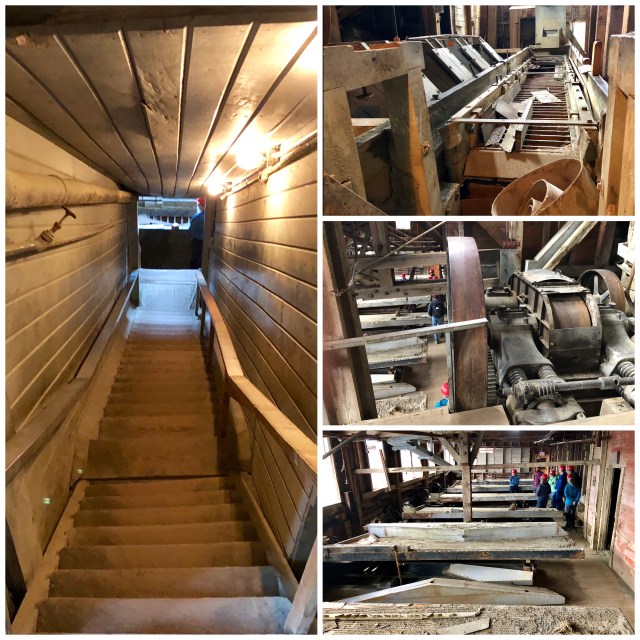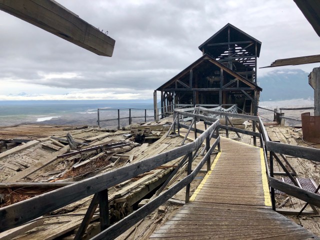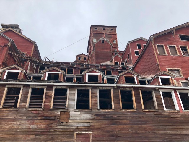 After our glacial lake kayaking adventure, we hiked up to the top of the concentration mill for a tour of the facility (the mill is only accessible via the tour). We entered below the tram cable that brought ore buckets down from the Bonanza Mine, one of five feeder mines on Bonanza Ridge. In years past, the entire structure you see in the photo, below, was roofed.