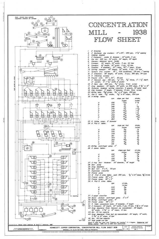 Although much of the early ore was of such high grade (70% pure) that it could be pulverized, bagged and shipped directly to the Alaska Syndicate’s smelters in Tacoma, Washington, without otherwise being processed, Birch knew the real profits were to be made by maximizing the concentration of copper so that no money or effort was lost shipping the unusable waste rock from which the copper was extracted. To deal with this issue, a 14-story concentration mill was constructed at Kennecott up the mountainside so that gravity could be used to facilitate the milling processes.