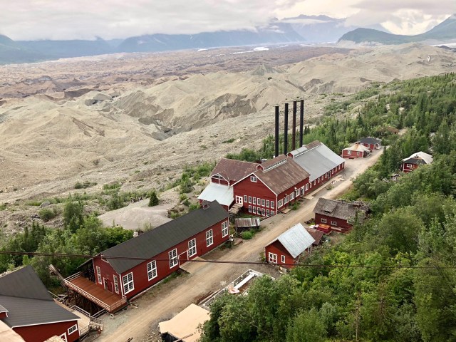 Looking out the other side to the northwest with Kennicott Glacier as a backdrop, we could see the shop and maintenance building in the foreground and the power plant with its smokestacks next to it. Various cottages and outbuildings were scattered up the road which, back in the day, wound its way as a wagon trail all the way up past Root Glacier to the Erie Mine.