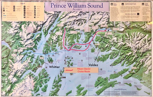 On the map, below, I’ve outlined our route in red. Tomorrow we will be taking the Alaska Marine Highway ferry to Whittier (blue dashed line), then we’ll drive to Cooper Landing in the heart of the Kenai Peninsula, hoping for sunny days.