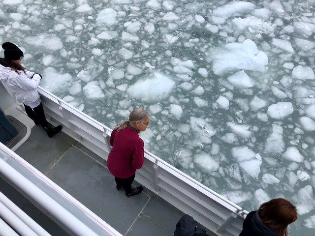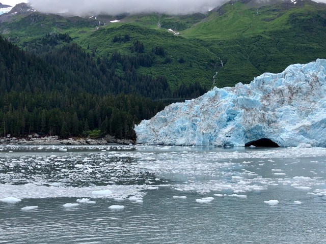 We sat there, engines off, for about half an hour, watching the glacier calve along its mile-wide face, dropping large and small bergs into the inlet.