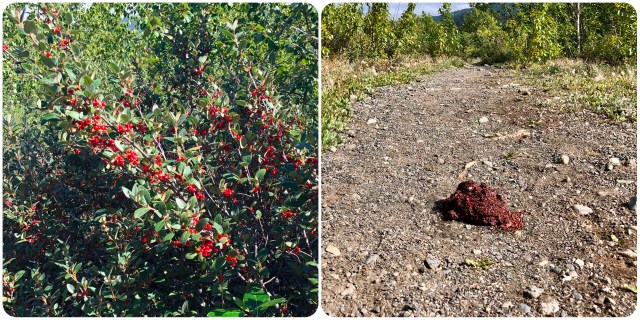 We had been warned that Black bears have recently been sighted in this part of the park and we saw plenty of active signs that bears had been ahead of us on the trail, including at least 25 piles of scat, littered with the seeds of Devilsclub and Canada Buffalo berries. Here’s a before-and-after photo of some Buffalo berries: