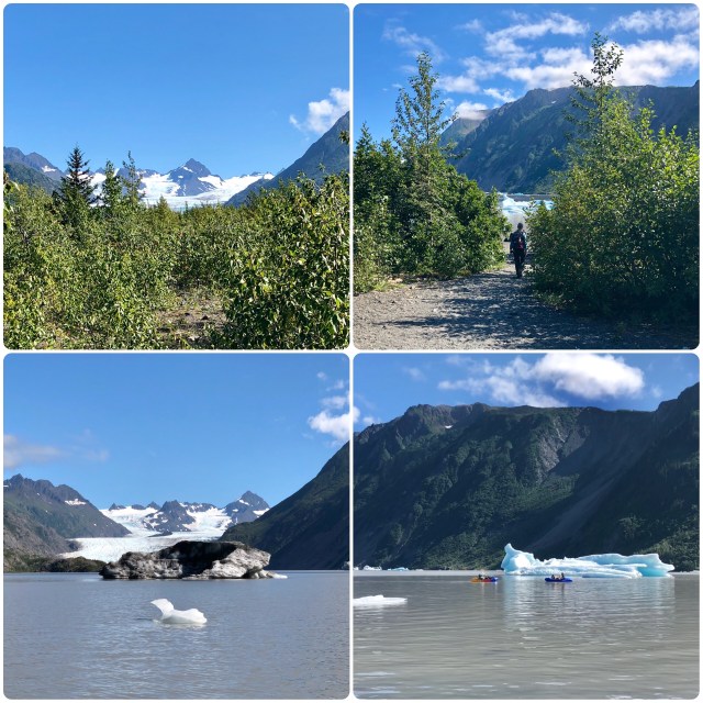 As we walked along the rock and gravel and finely crushed stone valley floor, we could see Grewingk Glacier off in the distance. Eventually, the trail opened up at the meltwater lake at the toe of the glacier, icebergs and growlers floating around. This was the headwaters of the river we had crossed in the tram. Out in the lake were the folks we had shared the water taxi with, paddling about in their Pack Rafts: packable, inflatable kayaks.