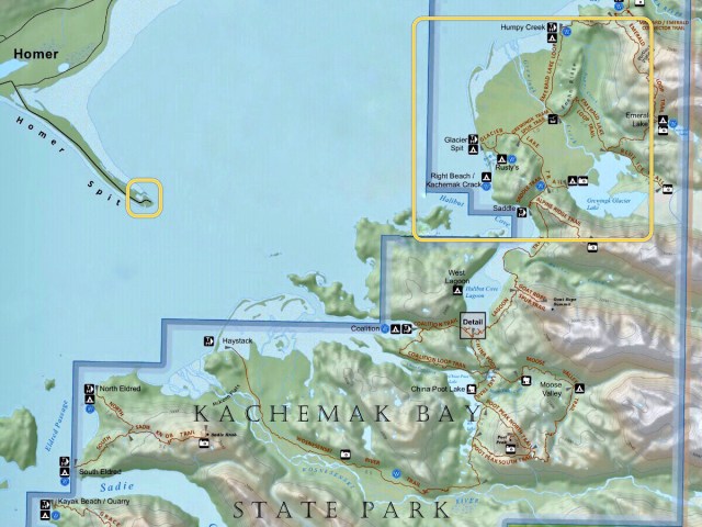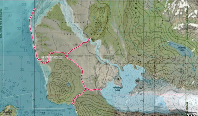 Our plan was to spend the day hiking all of the trails west and downstream of Grewingk Glacier Lake within the big yellow rectangle, below, a total of 9.0 miles, and we had five hours to do it, our designated pick up time to catch the water taxi back to Homer Spit being 4:30 p.m. No problem.