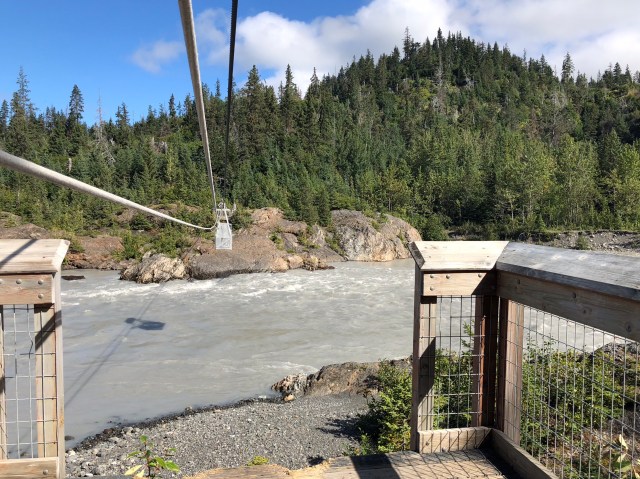 As it turned out, the tram was a rope & pulley river crossing in an aluminum basket. When we arrived, the basket was on the other side of the river. We pulled it across to our side, got in, and slowly made our way over to the other bank where we celebrated our physical prowess and had lunch before returning the way we came.
