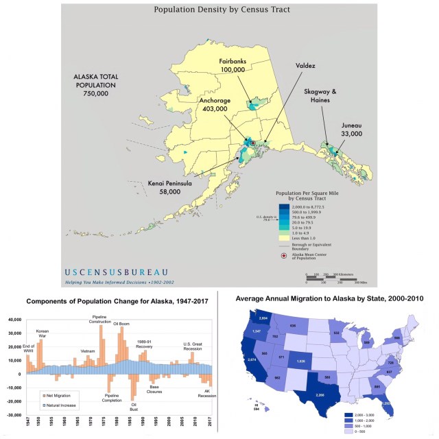 While I was reading about Alaska’s population statistics and trends, I came upon the graph and map, below. I thought it was interesting to see graphically how Alaska’s population has been affected by the coming and going of the military and oil, as well as where Alaska’s inward migration from the Lower 48 has come from in recent years. I was not surprised to see Washington as #1 and the bulk of migrants coming from west of the Rockies, but I was surprised to see Texas as #3 and Florida as #5.