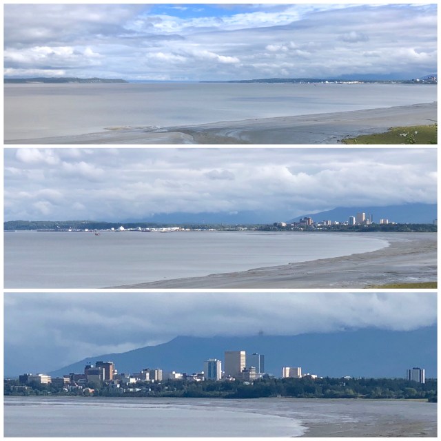 On Friday, we drove around the north side of Anchorage International Airport and stopped along the waterfront where I took these photos (from the white arrow on the map, above) looking up the Knik Arm, then turning slightly to the right to zoom in on downtown Anchorage.