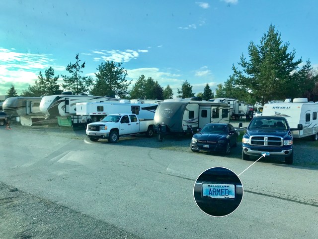 Back at the RV Park, I took this photo through the front window of our RV where our neighbors are mostly Alaskans (they do love their guns). Quite a contrast to the windshield vista we had on Homer Spit.
