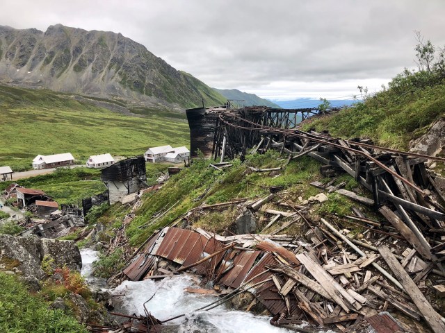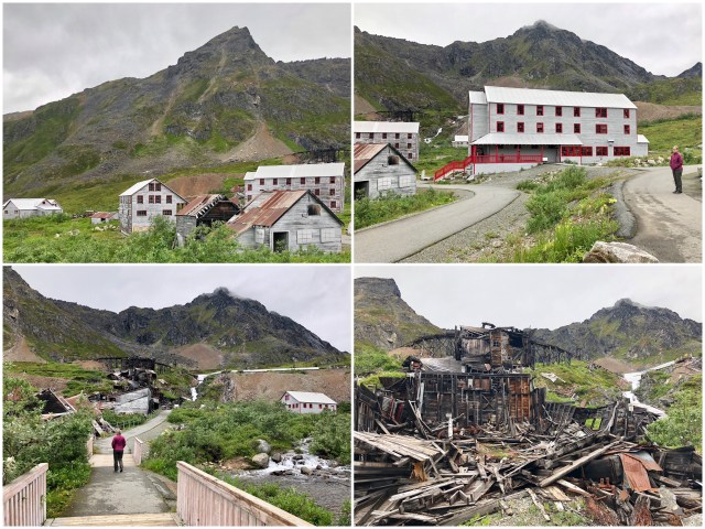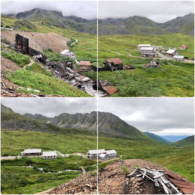 From the parking area, we could see the tailings from one of the mine tunnels running down the face of the peak behind the camp (top left in the photo, below). The State of Alaska has been restoring some of the buildings as funds to do so have been available, like the bunkhouse in the top right photo. Other buildings, like those in the two photos on the bottom, are beyond repair.