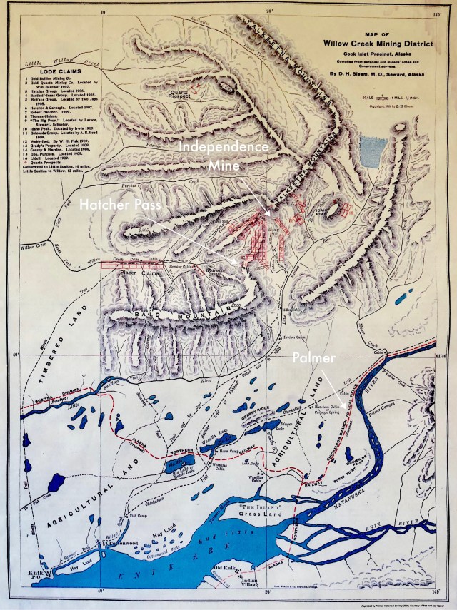 By 1917, there was a rail depot and a small community of farmers and miners at Palmer and, encouraged by the success of the homesteaders’ farms, the federal government opened an experimental agricultural station nearby to explore the potential for further agricultural development of the Valley. Meanwhile, up in the Talkeetna Mountains, the prospectors had hit it big along Willow Creek near Hatcher Pass (the map, below, shows the prospectors’ claims in red).