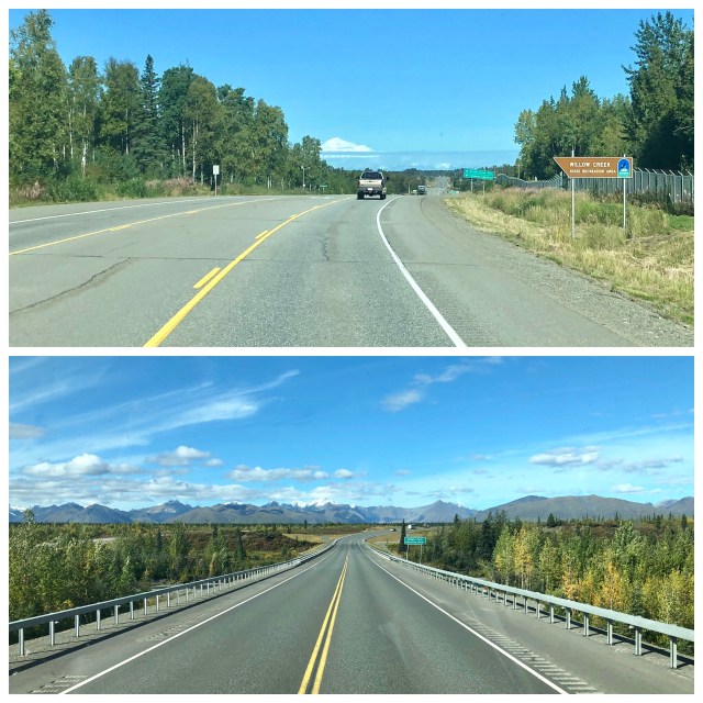 Known as Mt. McKinley until it was renamed by the Obama administration in 2015, “Denali” is the highest peak in North America with a summit elevation of 20,310 feet. The mountain is so tall that we were easily able to see it through our windshield more than 100 miles distant, even before we reached Willow as we drove north from Palmer on the Parks Highway, AK-3 (top photo, below).