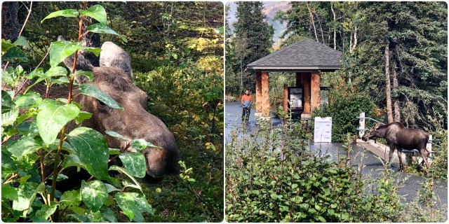 When the rain stopped for a few hours on Friday, we drove into Denali NP to the main Visitors’ Center to get maps and trail information and to sign up for a ranger-guided hike on Saturday. As we were leaving the building, Dale noticed a handful of visitors pointing into the bushes at the edge of the patio. I walked over and pulled back some branches and nearly jumped out of my skin when I found myself staring straight into the face of a full-grown moose!