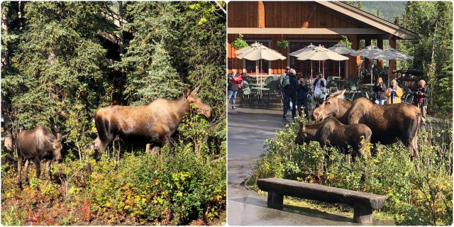 We backed up and walked around to the walkway to get a better and safer view and discovered that the moose was a mother and her calf was right next to her. Mother moose continued foraging in the bushes while her calf wandered out onto the walkway. Soon a crowd gathered and the pair of mooses (meese?) made their way over to a planter area and started munching away as the rangers finally woke up and started moving people back. Having their fill of the plants on display, cow and calf ambled over to the nearby wooded area to see what else they could find. Besides our sea lion surprise while kayaking in Glacier Bay, this was the next most incredible wildlife encounter of the trip.