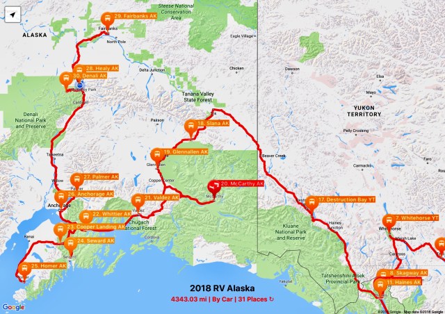 Fairbanks did, however, mark the northern-most point of our trip. From Denali, we will retrace our steps to Whittier where we will catch the Alaska Marine Highway Ferry home to Bellingham. Here’s a map of our journey in Alaska; a map of our trip prior to reaching Haines, Alaska, can be found here: