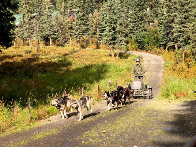 Leaving the main Visitor Center, we drove a couple miles further into the Park to see the huskies, actual working dogs that pull dog sleds for the rangers who monitor the Park during winter. We enjoyed the dog sled mushing demonstration and were amazed at how much these dogs are self-motivated to pull the sled. It gave credence to Jack London’s depiction of mushing in Call of the Wild which I read earlier on the trip.