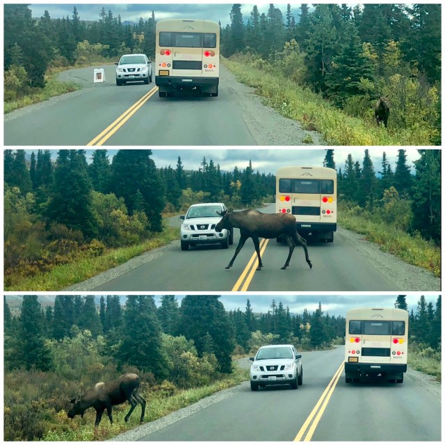 A couple miles further up the road, we came upon one of the tan tour buses, stopped in the middle of the road, so we slowed down, stopped and turned off the engine. Then, off to the right we saw a young male moose. He leisurely wandered across the road directly in front of us.