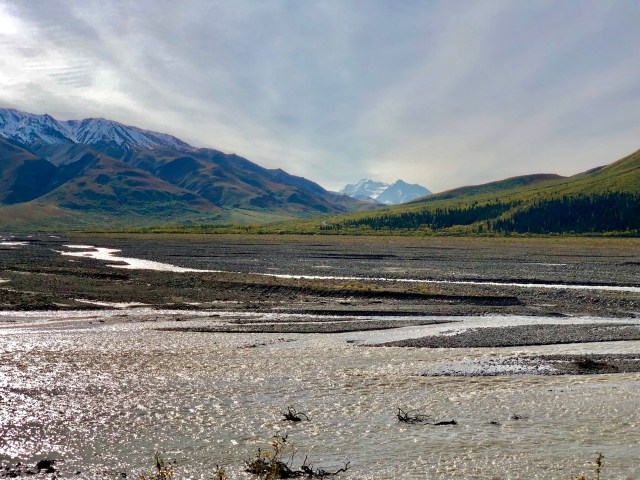 We drove on for about 45 minutes, pulling into Teklanika Campground at mile 29. “Tek,” as the rangers call it, is a dry campground, that is, there are no utility hookups of any kind. Consequently, the only thing required for us to set up camp was to find a vacant campsite and park. Having done so, we grabbed our day-packs and raced back out to the Park Road to wave down the 1:25 p.m. bus to Eielson Visitor Center to get a view of Denali on this clear day. Aboard the bus, we got our first glimpse an hour later as we passed Toklat River at mile 53 (if you’re not doing the math, the speed limit on most of the Park Road is 25 mph).