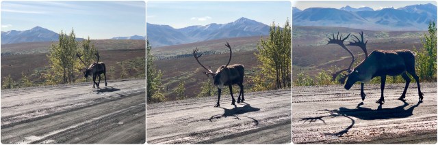 The Park Road is gravel beyond the checkpoint and rises for about a mile up the Primrose Ridge, above the tree-line. We merrily bumped along talking about how great it was to be on the Park Road in our own vehicle, rather than in one of those green park buses. Cresting the ridge we were surprised by an adult caribou plodding toward us on the road. We stopped and turned off the engine. Unfazed by our presence, this solitary ungulate walked on by, head-faking our way at one point, making me think he was going to walk over to the RV (upper middle in photo, below).