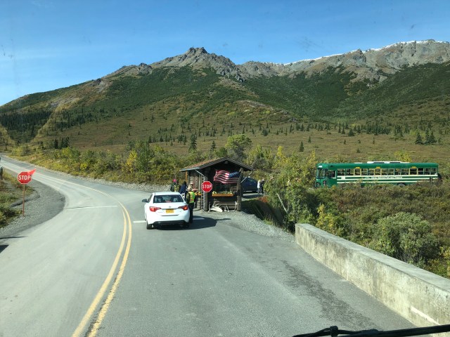 The morning after our Disco Hike at Stoney Creek, we drove the RV into Denali on the Park Road, stopping briefly at the ranger checkpoint just past the bridge over Savage River. That green bus to the right in the photo, below, is one of the park buses that run the length of Park Road about every half hour, delivering and picking up sightseers and hikers. The round-trip from the bus depot to the end of the road at Kantishna, mile 92, takes 12 hours and costs $60. There are tan buses, too, but those are the guided tour buses, mostly filled with cruise ship passengers on excursions from Seward or elsewhere in Alaska.