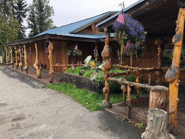 Being in a touristy mood, we also stopped at the Knotty Shop, another roadside attraction about 15 miles down the road from Santa Claus House. Given that the place is known for the spruce burls that hold up its roof and fence its front porch, we hoped to find some of those woody growths for sale, but the place was mostly stocked with T-shirts and “souvenirs.”