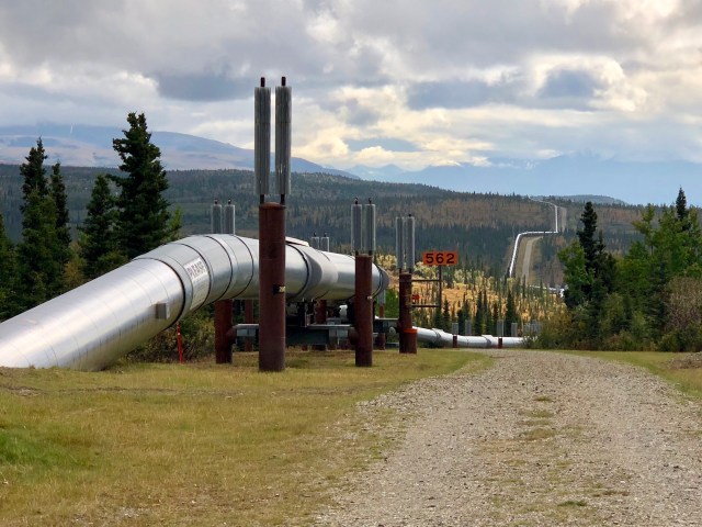 As we traveled south parallel to the east of the Delta River, the pipeline kept porpoising around us, first above ground on our left, then diving below the surface only to reappear again on our right.