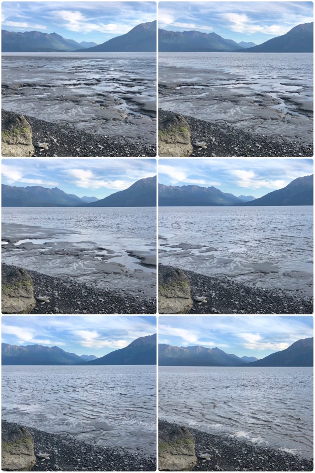 A “tidal bore” or “bore tide” is essentially a wall of water caused by extreme sea tides rushing up adjacent coastal rivers having a large tidal range where the incoming tide in confined to a narrow channel – exactly the conditions that exist along Turnagain Arm. The best time to see a bore tide is during a new or full moon and we had made a point of getting to Bird Creek on such a day a couple hours before the bore tide was to arrive.