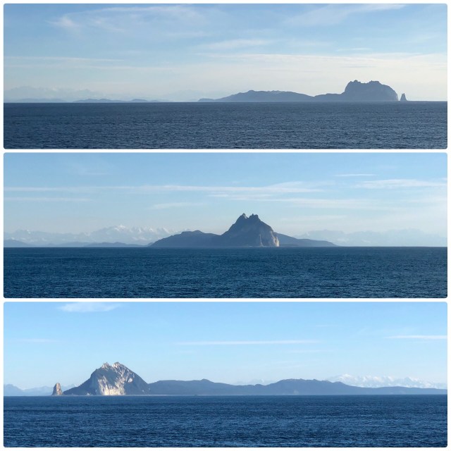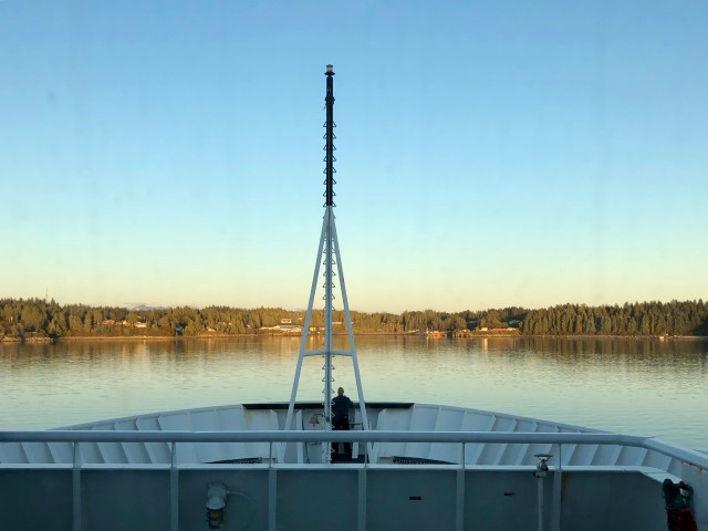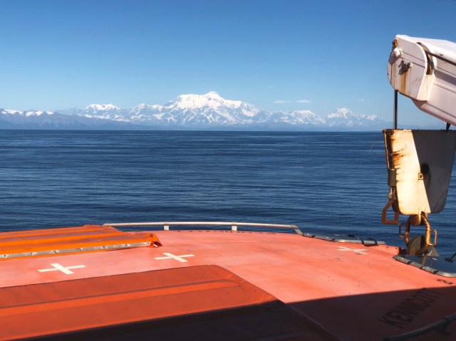 Having booked a cabin for the voyage, we were already asleep in our bunks when the ship cast off from Whittier just before midnight. The next morning, we went topside after breakfast, just in time to see Kayak Island coming up off the port bow.