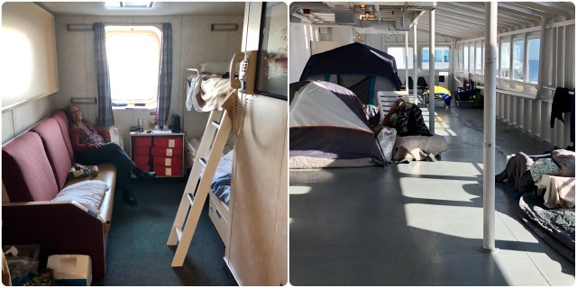 We opted to pay for a cabin (photo below, left), although it’s not required as a condition of passage. Our cabin was actually quite comfortable and included an ensuite bathroom with shower, bunk beds and a sofa. It wasn’t much different than being in our RV. Those who didn’t take a cabin were allowed to set up camp, literally, in the solarium on the top deck (photo below, right). It was like Woodstock up there.