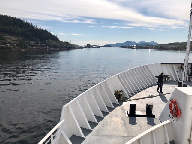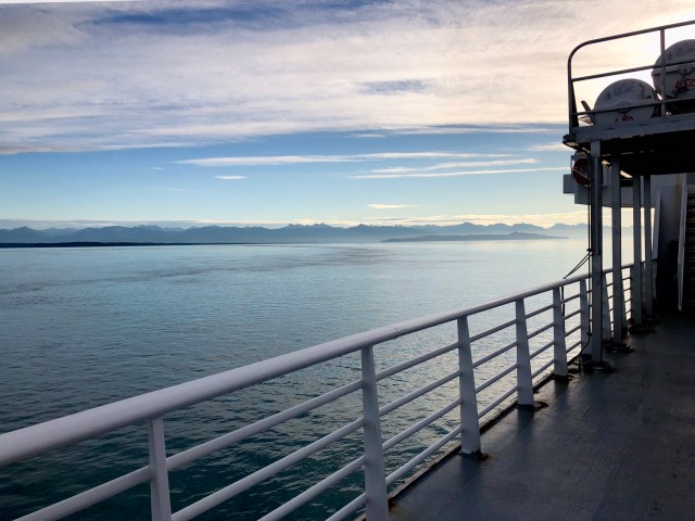 Our ferry, the M/V Kennicott, is 382 feet long, 85 feet wide and draws 17.5 feet. While it is not a cruise ship – nor does it rival the gigantic ferries of Europe – it is a big vessel with a gross deadweight of nearly 10,000 tons and a cruising speed of 16 knots (19 mph). Consequently, in the protected waters of the Inside Passage, it is extremely stable and quiet … for the most part (more on that later).