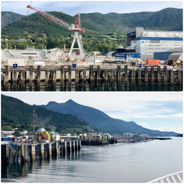 As you can see, Ketchikan is a busy port, lined with containers and docking facilities for ferries, freighters and cruise ships, two of which were in port near downtown when we arrived – you can just make them out in the distance in the photo, above.