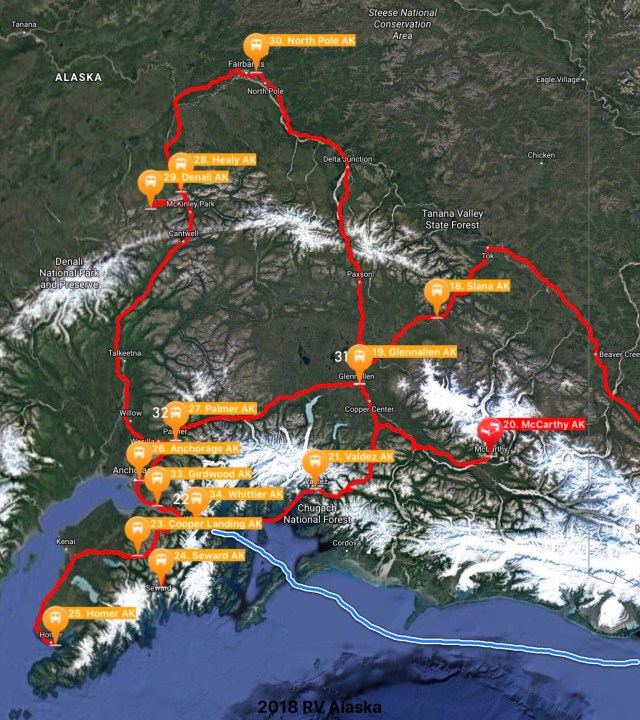 And while I’m counting, our motorhome odometer says we drove 3,855 miles, not including another 600 miles, give or take, in the Jeep. Here’s our route, broken into two maps so the locations are legible (the bottom map is at a smaller scale than the upper map):