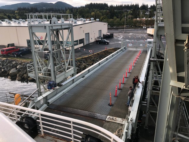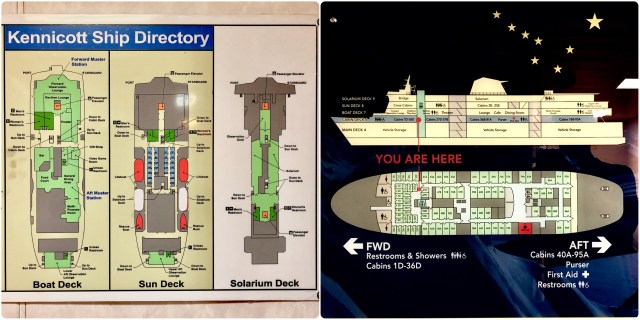 That elevator system is also used for loading vehicles at docks that have no ramp, like the dock at Yakutat. You can see it in operation in the bottom grouping of photos in my last post. The elevator is located immediately above the cabin we were assigned, 91-A. Apparently, the crew didn’t properly secure the system when we departed Yakutat Tuesday evening and as a result it made a continual racket into the night. Fortunately, the purser was able to move us into a cabin further toward the bow, 45-A, for the remainder of the journey and a sound sleep.