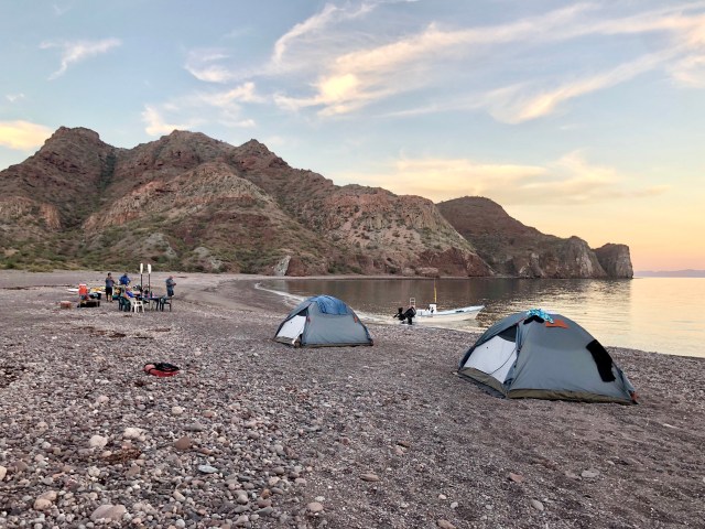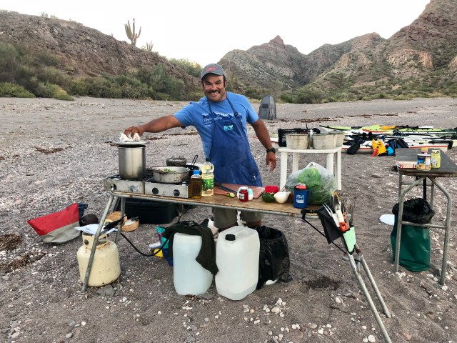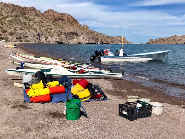 We ended our first kayaking day by beaching at the north end of Bahía Santa Marta. Lino anchored the panga and we helped unload the group gear onto the beach. I sensed from the grin on his face as he swung the loaded cooler over the gunwale onto my shoulder that I was being tested; he wanted to see if I would be able to wade to the beach with the load without dropping it or toppling over into the water. Growing up on the ocean in South Florida and the Bahamas, I had my eye on him, too.