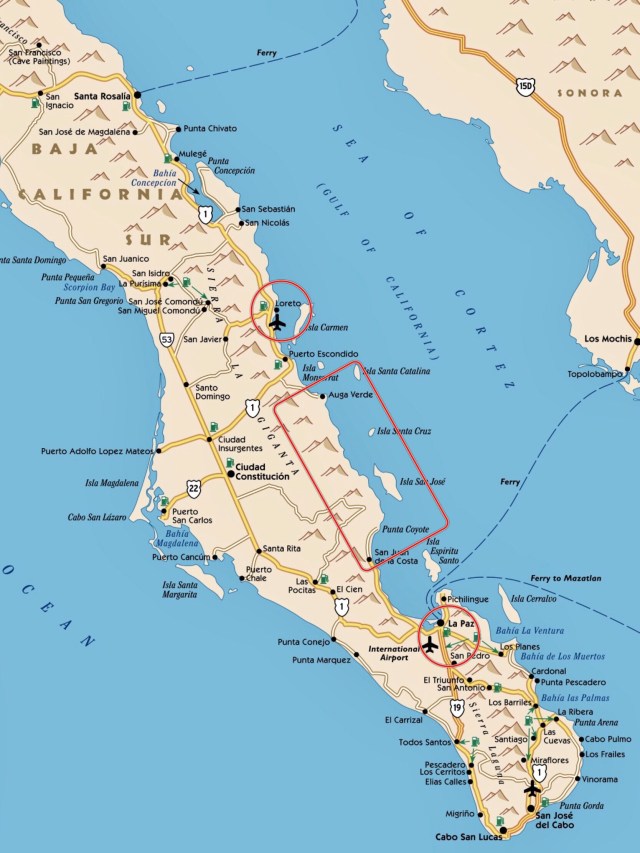 The general outline of the trip was straightforward: drive from Loreto to the beach at Auga Verde (Green Water) to launch the kayaks; paddle south along the coast to Punta Coyote; then, drive to La Paz. As you can see from the map, below (red rectangle), there’s absolutely no development along that stretch of coast – but, of course, that is why we had come!