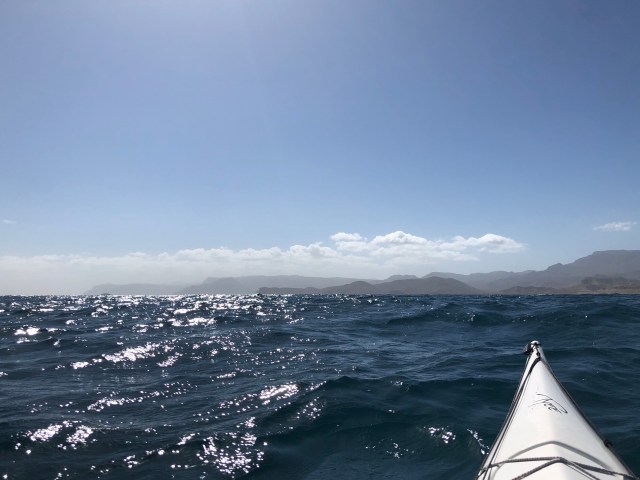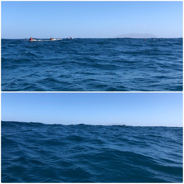It’s difficult to get a sense of the size of the seas from these photographs. Suffice it to say that these would likely be classified as 2- to 3-foot swells, with some 4-footers; big enough to necessitate us clipping our skirts (normally worn loosely around our waists) around our cockpit coamings to make our boats water-tight.