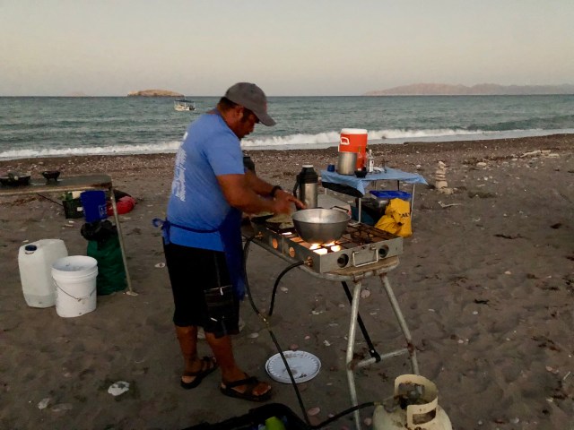 We were not the first to arrive. A group of about 20 kayakers was already camping here. Together with their 5 guides and 2 pangas, they had created a little village at the north end of the beach, complete with a large community dining tent. They came down to the beach en masse to help us land in the surf, full of questions. Their guides had made today a lay-day for them due to the wind and waves and they wanted to know how it had been for us kayaking from Timbabichi.