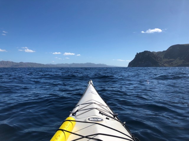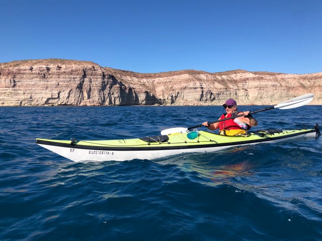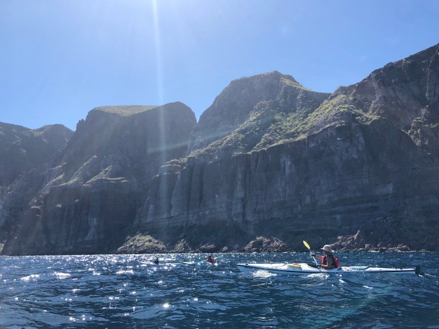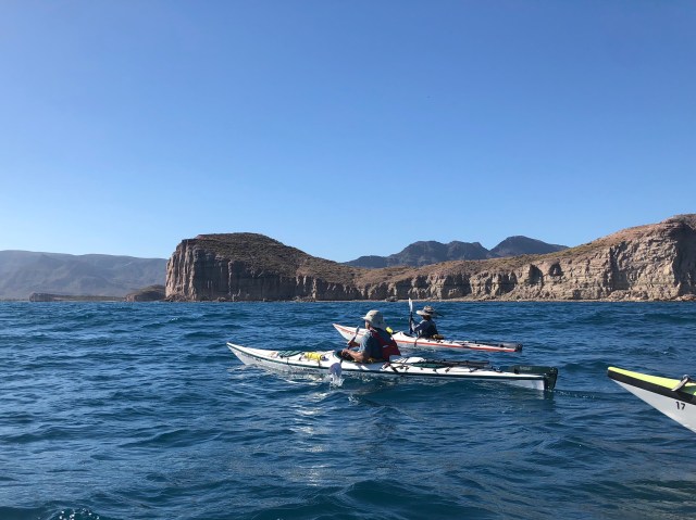 Mario had told us the night before to prepare for an early start and a long day. We would be paddling along a stretch of coast with limited opportunity for landing, so we wasted no time getting on the water. About a mile south of Ensenada la Laguna, we passed a spectacular un-named headland; Mario, on point, followed by Scott: