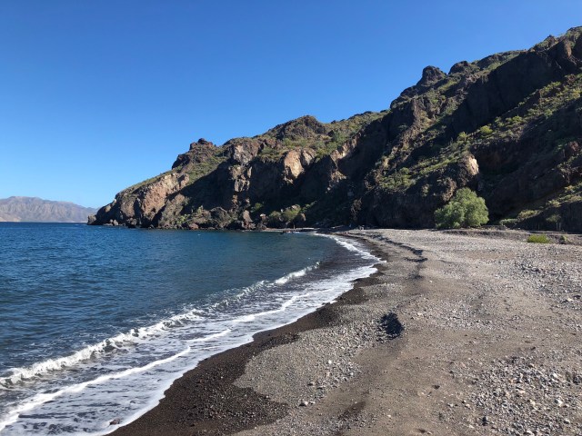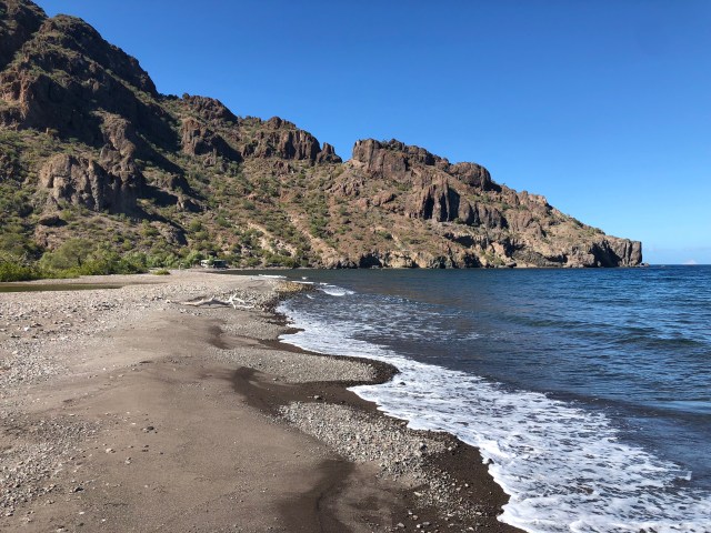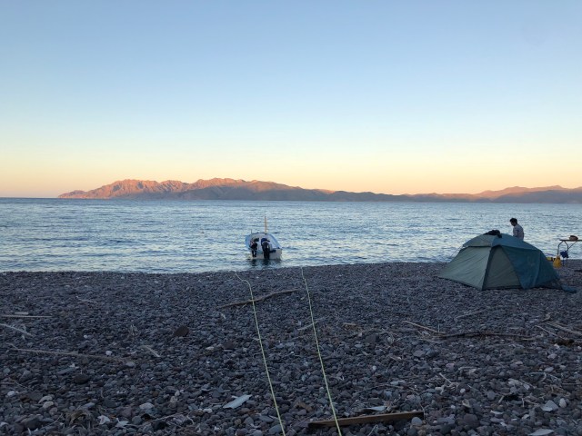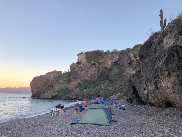 Under the lookout of a lone Elephant cactus above us on bluff, we had a one-pot pasta dinner and discussed the fact that our provisions were getting low and that we would need to stop at the village of San Evaristo, 7 miles to the south, to resupply.