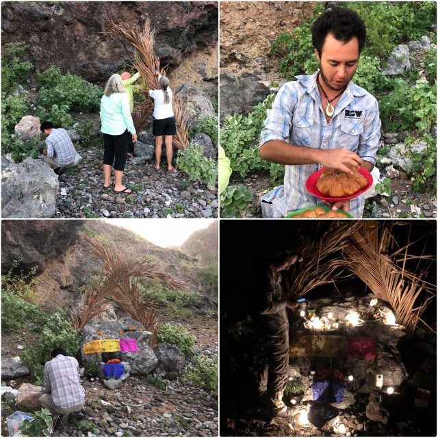 Having retrieved a potted Marigold from the panga that he had brought along, Mario explained that it is traditional in Mexico to build an ofrenda for Día de Muertos – a small altar to honor deceased relatives – and he invited us to help him to prepare his. He said that the Marigold is one of the essential parts of the ofrenda, its strong scent and vibrant color helping guide the souls of the deceased to the celebration.