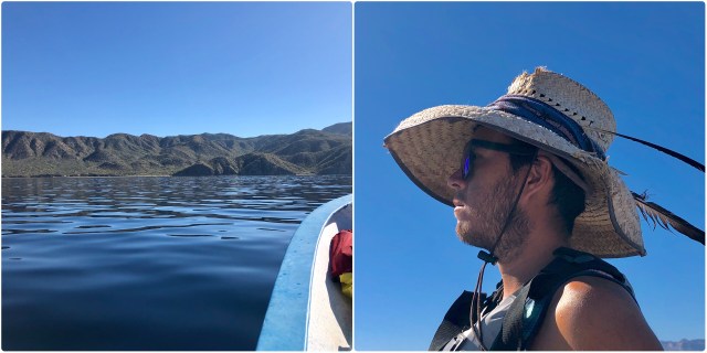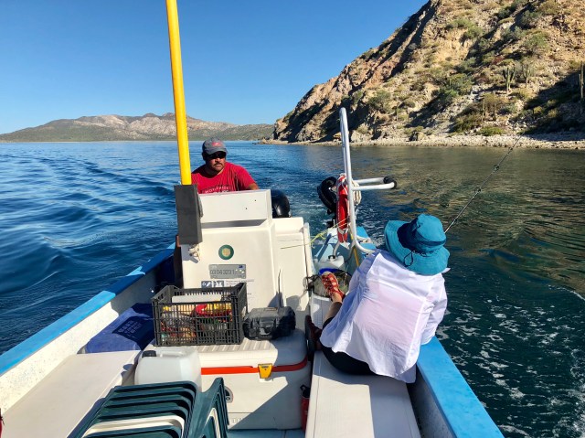 Leaving our campsite at Nopoló in the rearview mirror, Lino pushed the panga up onto a plane, then rigged a pole for fishing, as we sped eastward.