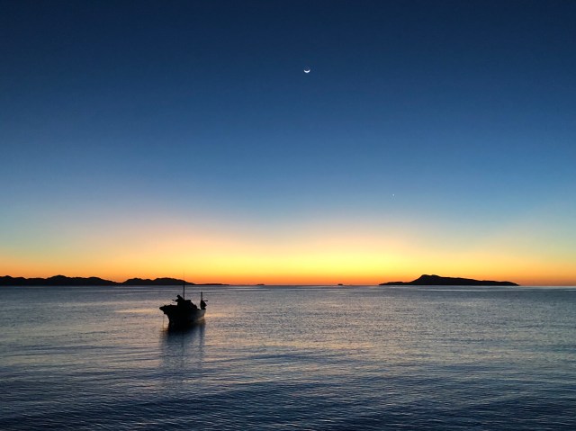 I was greeted this morning by a smiling, distant moon and watercolor sky. As my eyes scanned the eastern horizon, I also noticed a planet (although I don’t which), just visible above the golden haze of morning. Lino, who, as I mentioned, sleeps on the panga, was already awake and fishing. Whether for food or for fun, I don’t know, but he is a born fisherman, so is there really a difference?