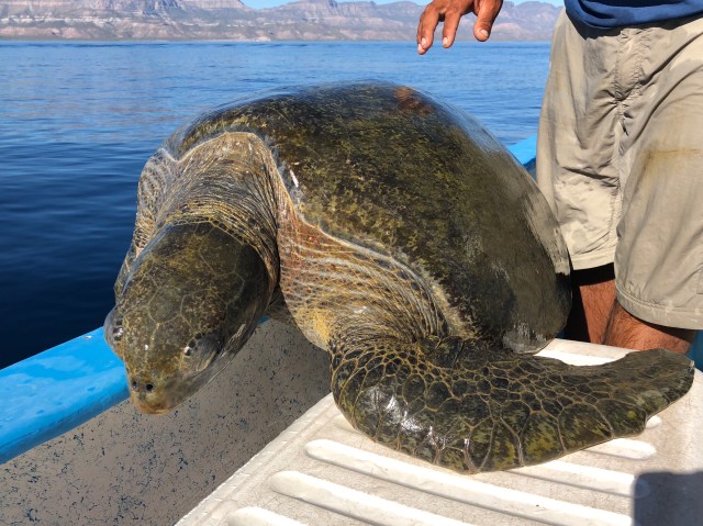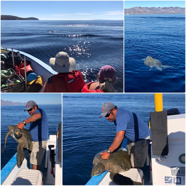 Near mid-channel, someone spotted a turtle and Lino veered over to it. The turtle appeared unable to dive, continually failing in the attempt. Lino said that it was a male green sea turtle and that when green turtles mate, the male can end up with air trapped under its shell, making it buoyant until the air escapes or dissolves, which can take hours. Lino was concerned that since the turtle was in a part of the channel frequented by local fishermen and yachtsmen from La Paz, it could get run over. So, he stopped and hoisted it aboard.