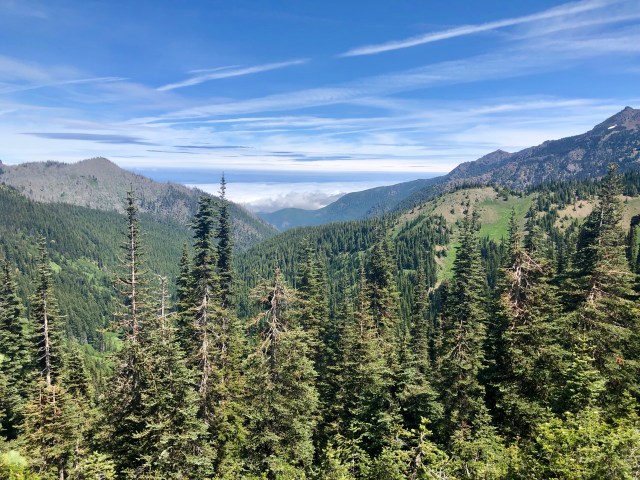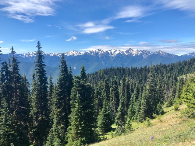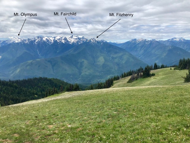 Looking south from the same point on the trail, we had a fantastic view of the Bailey Range of the Olympic Mountains and its highest peak, Mount Olympus (elev. 7,979 ft):